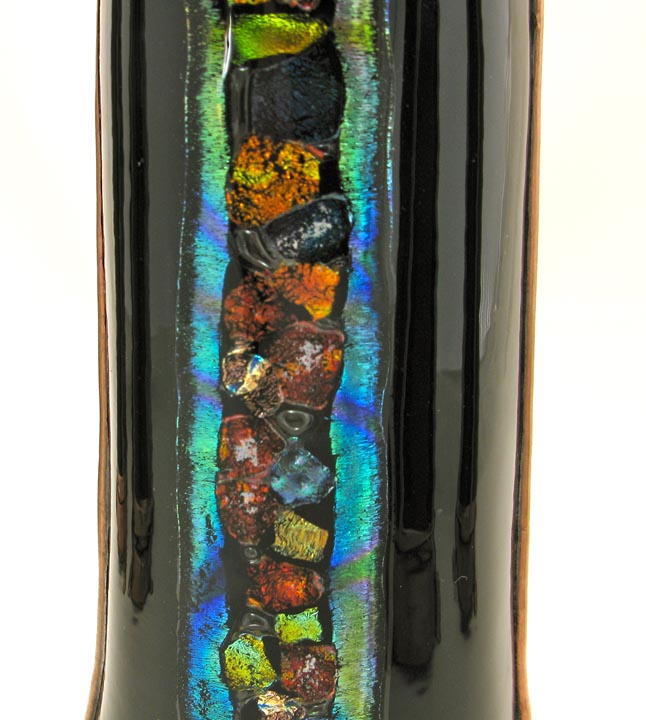 The exterior body of Magnum B is black glass with 2 dichroic stripes surrounding assorted dichroic pieces, fused vertically along the body and then all encased in clear glass.