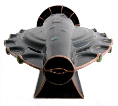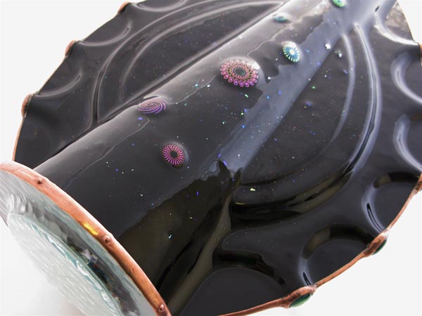 "Odyssey" is a limited edition of 5. Three are black with fused dichroic embellishments and two are white with hand painted color added to provide a subtle accent to the body.