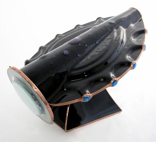 "Odyssey" was created for the exhibition at the American Folk Art Museum. The body is multi-dimensional fused and slumped glass with a bearing mounted, free-turning, slumped glass object case containing specially made lampworked, fused and handcut glass. A tapered two-mirror system produces perfect 10-point images.