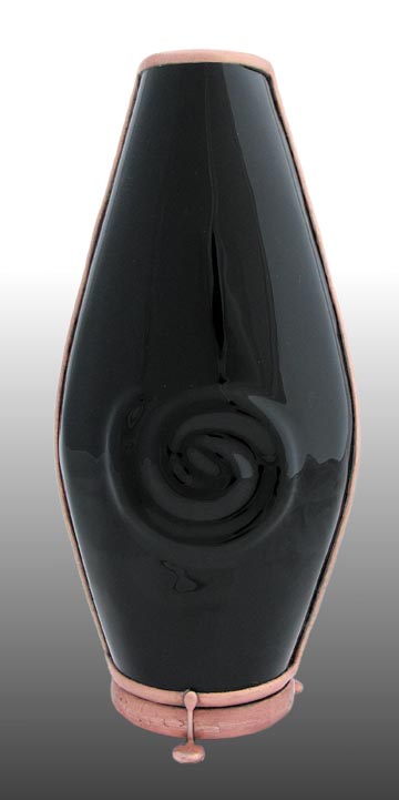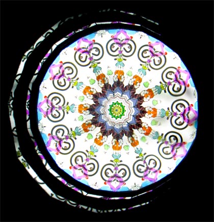 The body of the scope is slumped glass with an embossed spiral design on both sides, available in either black or white. A tapered two-mirror system, combined with a modified 3rd mirror, creates a large 12-point image, that suggests an interesting spiraling effect. The dry object case has been sandblasted to provide a soft spiral background and contains lampworked glass, many of which are twisted to compliment the spiral theme.