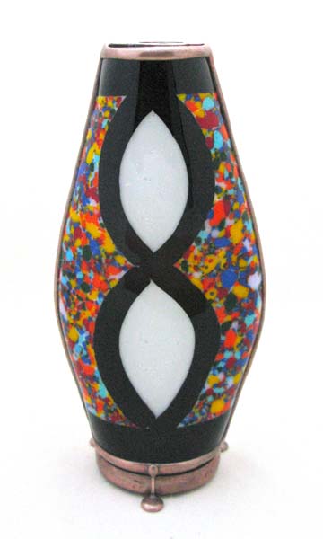 The exterior is fused multi-colored glass, surrounding the symbol for infinity, and then slumped into an appealing flask shape. Perfect 11 point images are produced by the tapered 2-mirror system. All the glass in the dry, free-moving object cell has been selected to create ”over an infinite“ number of very colorful images and is framed by “more infinity”.