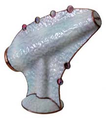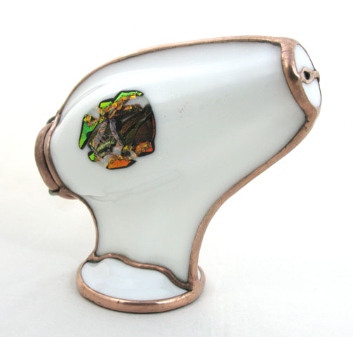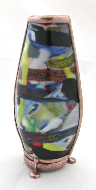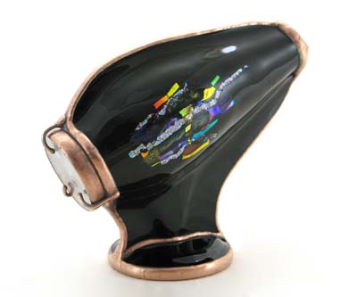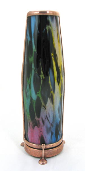 This one-of a kind kaleidoscope was created as a tribute to Cozy Baker as part of the silent auction held at the Brewster Kaleidoscope Society's convention in Covington Kentucky, May 12-15, 2011. Featured are numerous glass working techniques. The body is fused and slumped glass over a multi-dimensional form, representing the colorful fashions Cozy often wore. A tapered two-mirror system provides a large 9 point image. The dry object case contains lampworked, fused, and handcut glass, plus dry glass ampules. The scope stands 10” tall. A matching fused and slumped mask and pendant are part of this tribute to Cozy. Recipient of the People's Choice Award