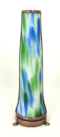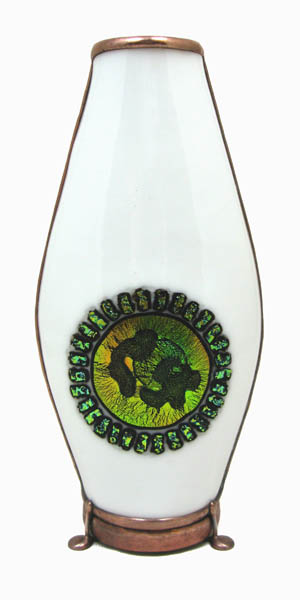 Combining the features of the Brewster, Bush and Karadimos kaleidoscopes. A slumped glass body houses a tapered 2-mirror system producing perfect 10-point symmetry. The smooth turning, bearing-operated object cell contains 2 liquid-filled ampules, lampworked glass, and a screen, similar to that found in the Bush kaleidoscope, combined with dry-filled ampules, lampworked and dichroic glass, characteristic of many Karadimos scopes. This 10” handheld scope sits upon a walnut stand.