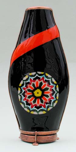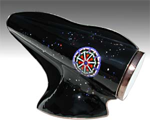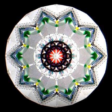 In a kaleidoscope related area, Charles is now creating multilayer fused paperweights and glass sculptures. The same technique he used to produce the decorative mandalas on the "Karascope", "Mandala White", and "Mandala Black" is being applied to these beautiful pieces. |