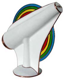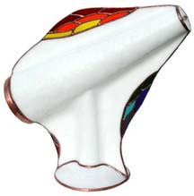 The exterior of this 4” glass kaleidoscope has offset, embossed half circles on either side of the slumped main cone making it very comfortable to hold. Similar to the Winged Mini Cone, the optics are produced by a two-mirror system and creates a very appealing and intricate 8 point image. This scope is available in a wide assortment of solid and patterned exterior colors. |