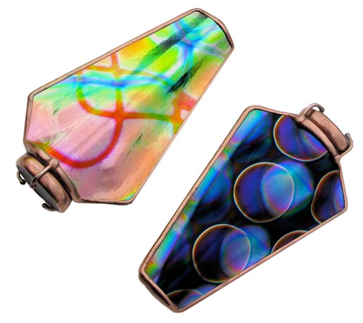 The body of "Dichro Mini" is slumped, patterned, dichroic glass, offering a shape that is very comfortable to hold. Dichroic glass is also the main ingredient of the dry object case. It has been specially treated and used as the background glass of the cell, enhancing and complementing the free moving glass pieces contained within, the majority of which are also hand selected and lampworked dichroic glass. "Dichro Mini" is 4” long and features a two-mirror, 8 point system producing incredibly intricate and literally “glowing” images. |