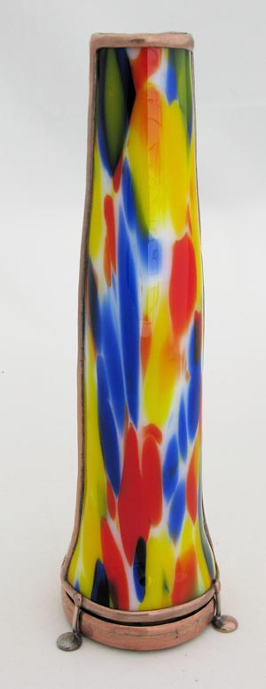 The body of this one-of-a-kind kaleidoscope is multi-colored and multi-layered fused and slumped glass.