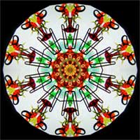 Inspired by the paintings of Andy Warhol, multiple images of Sir David Brewster decorate the exterior slumped glass cone. A tapered 2-mirror system produces 12 point images, with a red panel as the third side. The object cell contains 3 separate chambers, one including a portrait of Sir David, one containing glass beads, and the third filled with lampworked glass. 10“ tall